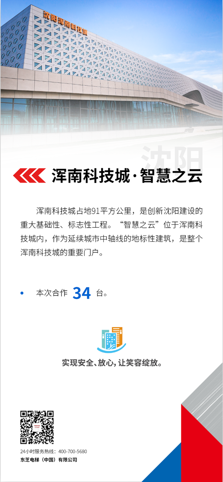 2024年7月1日,由中铁上海局承建的浑南科技城核心启动区正式开园,东芝电梯为浑南科技城的“智慧之云”项目提供了34台产品,其中1350KG 大吨位客梯26台、自动扶梯8台。