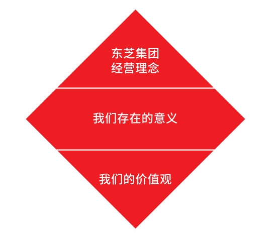 东芝集团理念体系由三个要素组成:东芝集团经营理念、我们存在的意义和我们的价值观。